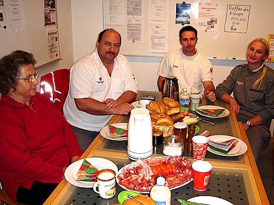 Roten Kreuz Der Gemeinschaftsraum ist sehr einladend und wohnlich. Helmut Gschanes erläutert: Das Haus ist Tag und Nacht besetzt. Jeder, der Dienst hat, ist an der Dienststelle. Es gibt keinen Dienst von zuhause aus. Da läuft nicht einmal mehr viel über Sprechfunk. Es gibt Daten-Terminals in den Fahrzeugen. Die Bezirksstelle in Weiz koordiniert die Einsätze. Aber das Telefon kommt immer wieder ins Spiel. Gleisdorf hat vier hauptamtliche Leute und einen Profi in Sinabelkirchen. Die gesamte Situation wird durch rund hundert Freiwillige verstärkt. Das Frühstück läßt diesmal nichts zu wünschen übrig. Der Tisch ist nicht jeden Samstag so reichlich gedeckt, verrät Erika Seidl.